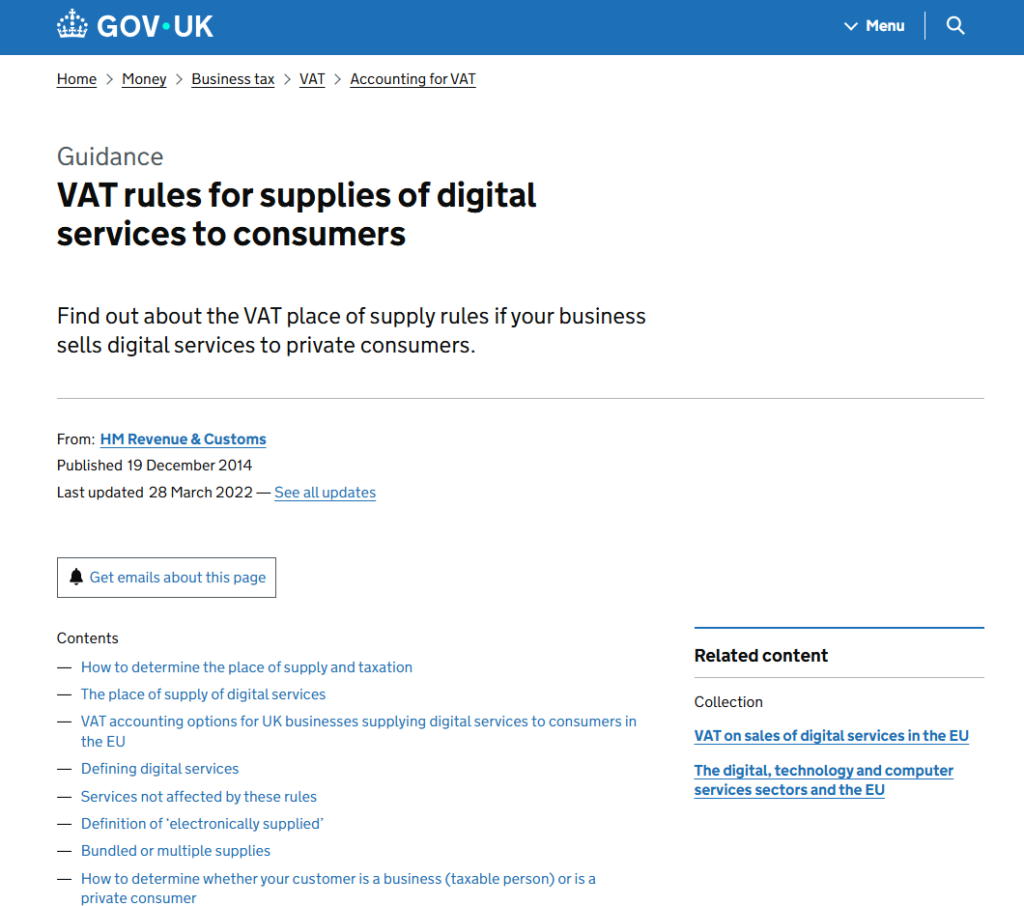 HMRC has specific guidance on digital services to consumers and wider place-of-supply rules for services. – Read more