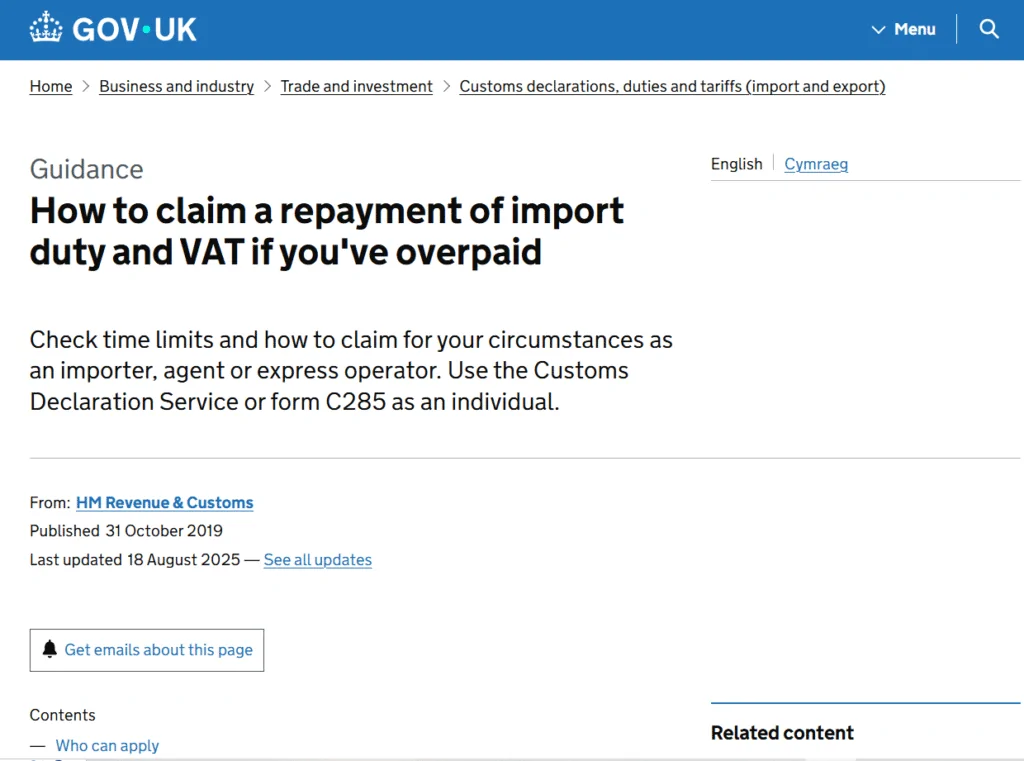 - Download the form – from HMRC’s official website: https://www.gov.uk/guidance/how-to-apply-for-a-repayment-of-import-duty-and-vat-if-youve-overpaid-c285.