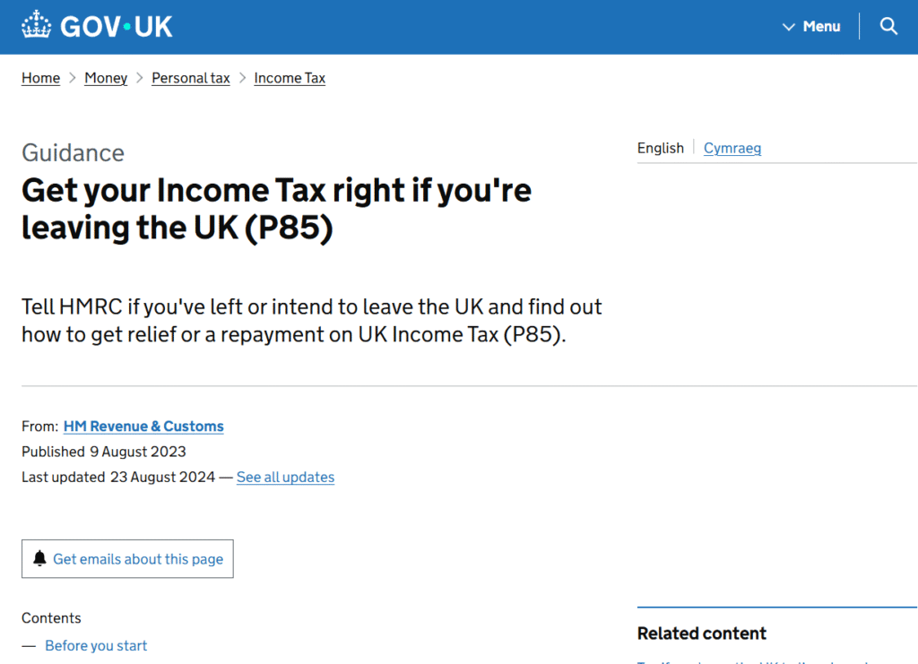 - Download the form or or fill out on the website – https://www.gov.uk/guidance/get-your-income-tax-right-if-youre-leaving-the-uk-p85