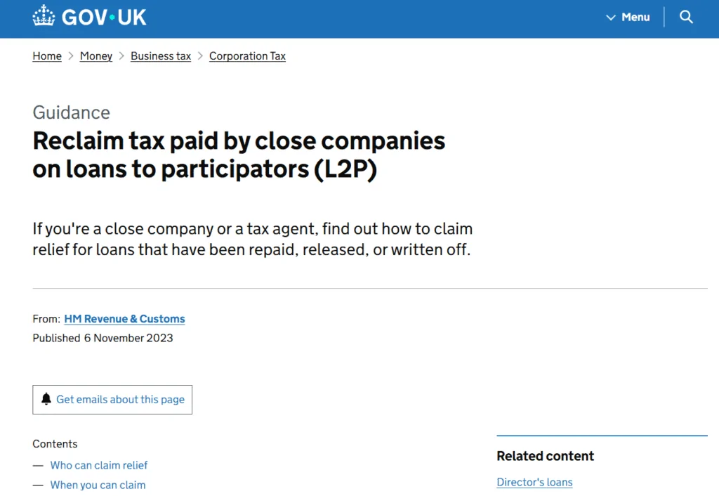 Official link: https://www.gov.uk/guidance/reclaim-tax-paid-by-close-companies-on-loans-to-participators-l2p