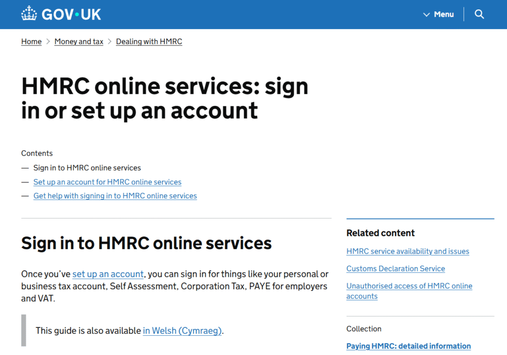- HMRC online services – https://www.gov.uk/log-in-register-hmrc-online-services
